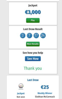 Lotto results! Alas, there was no jackpot winner in last nights draw which means the fantastic jackpot of €3,000!!! is still up for...