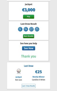 Lotto results. There was no jackpot winner in last nights draw which means next week’s jackpot stands at an amazing €3,000!!! Congratulations...
