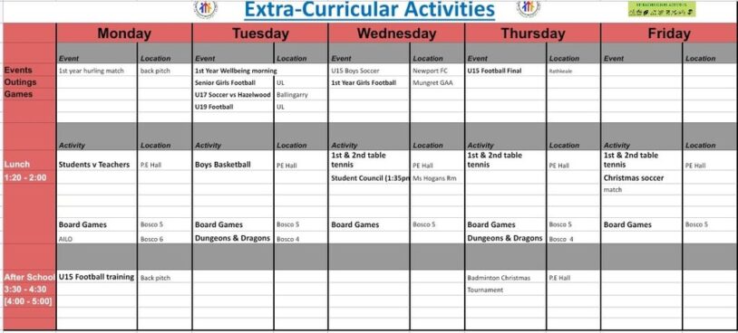 Please see attached extra curricular activities for week commencing 15th December.