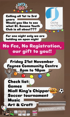 Foynes Youth Club along with the nation wide Oiche na hOige are hosting an Open Night this Friday 21st November. Details on the photo attached.