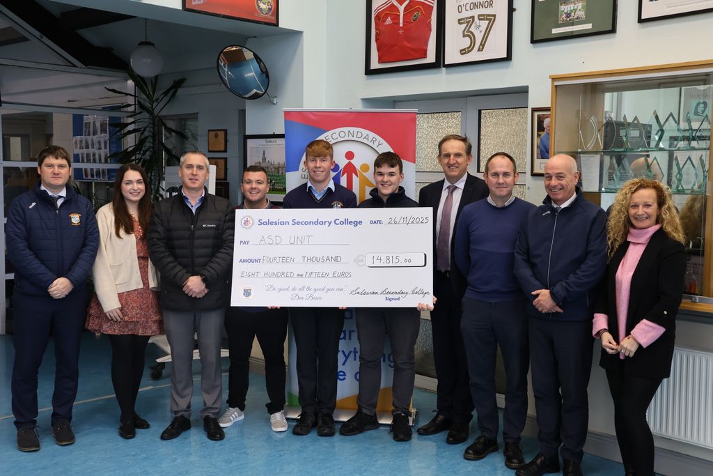 Photographed here are members of our Vechicle Run Committee with a cheque for €14,815. We are absolutely thrilled with the culmination of donations from so many different sources in the community. Since the Vehicle Run, in early October, we have had two additional sponsors: The Bee Keepers Association in Co. Limerick and Analogue Devices Limerick.Thank you to all our sponsors for your genorosity throughout this campaign to raise funs for our Den/ASD students. We are enormously grateful to our parent sponsors and business community sponsors: Thank you to Mike Fitzgerald in Kenry School of Motoring and to Morenane Transport, Kirby Engineering and Construction, Kerry Agri, Deel Bakery, 061 Bakery Kildimo, SC Catering, EMC Accounts, Lea Tours, D&M Garden Centre, Safe Aid Training, Downeys Electrical Services, Mid West Tyres, MT Mackessy Business, Munster Radon, OCE Kildimo, Pro Clad Insulation, Matt Kelly Productions, Chawks Electrical in Rathkeale, C Design, DTops in NCW, Irish Cement, Heating Engineering Supplies, Samco Agri Sales, Sysco, Crecora Mills, Brian Geary Motors, Cois Sionna Desmond Credit Union and Limerick Race Course. We are also very grateful to those sponsors who have chosen to remain anonymous. Thank you also to all our parents and business partners who provided spot prizes for our raffle which contributed greatly to this donation.