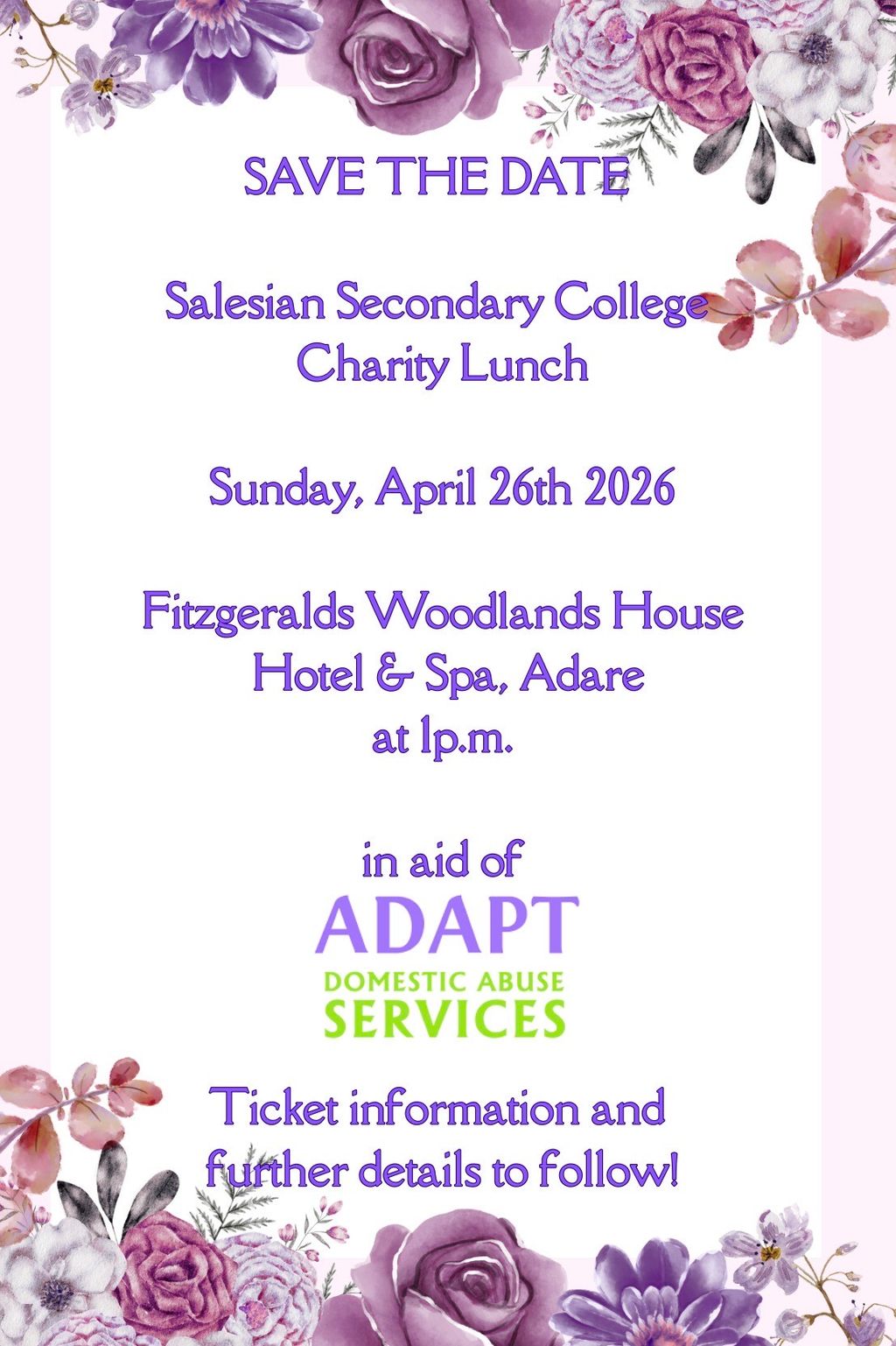 The annual Salesian Secondary College Charity Lunch is on Sunday, April 26th 2026 in Fitzgeralds Woodlands House Hotel & Spa, Adare and this year, it is in aid of Adapt Domestic Abuse Services. Further details and ticket information will follow, but for now, put the date in your calendars for a great day in aid of a very worthwhile cause here in Limerick!