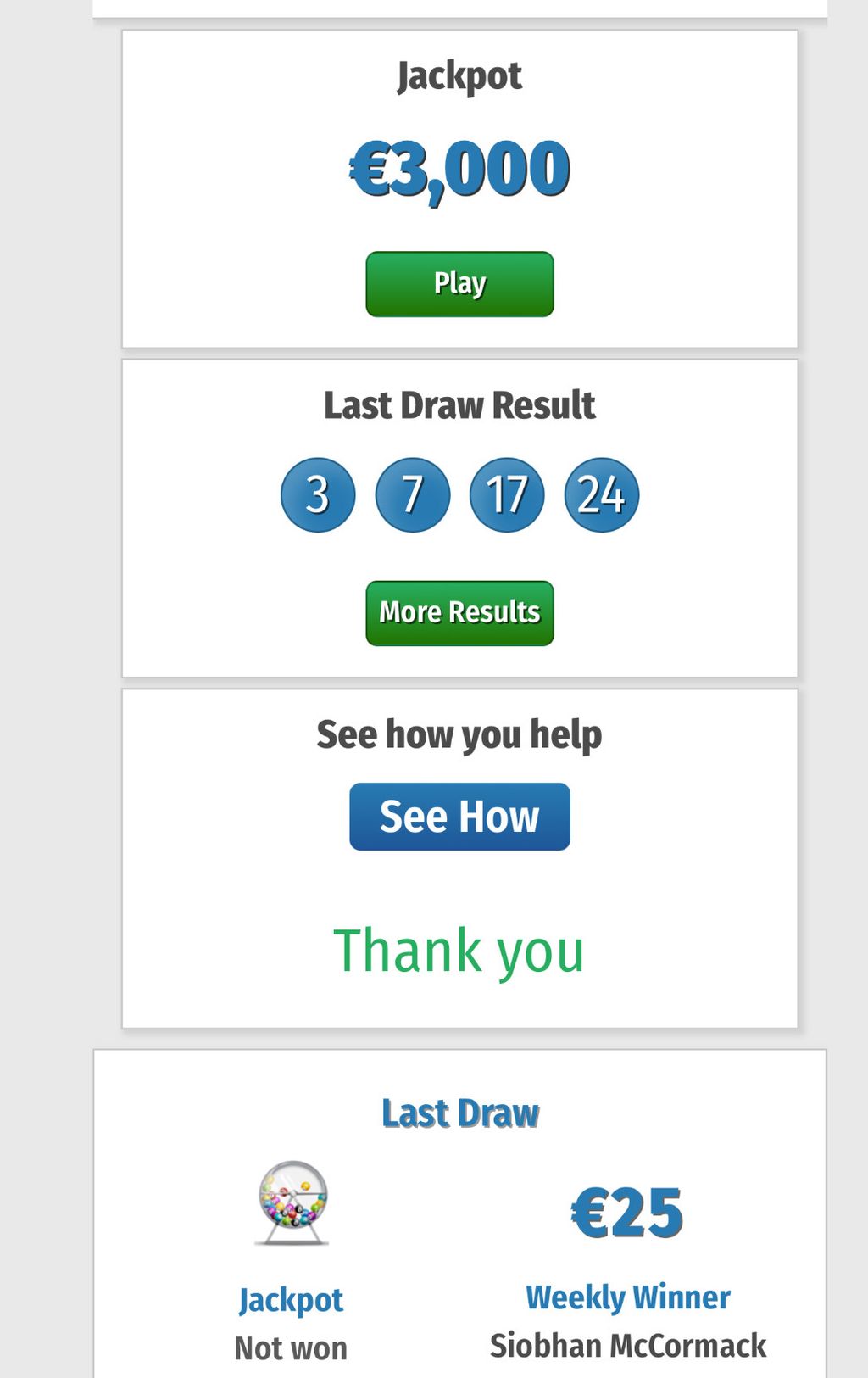 Alas, there was no jackpot winner in last nights draw which means the fantastic jackpot of €3,000!!! is still up for grabs!
